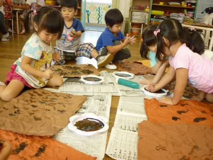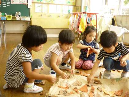 子供たちは、画用紙や米袋に手でスタンプをしたり、ローラーで色を塗ったりして遊んでいます。出来上がった作品を使い、岩や塀を作り、岩のトンネルをくぐったり、かくれんぼをしたりして忍者ごっこを楽しんでいます。