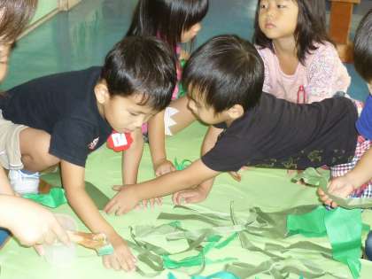 子供たちは、毎日忍者ごっこをして楽しんでいます。そこで今日は、忍者になって隠れる修行をするため、草作りをしました。画用紙をくしゃくしゃに丸めてから広げ、細く指でちぎり段ボールに貼る活動をしました。自分たちで作った草に隠れて明日から楽しみたいと思います。