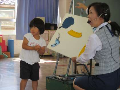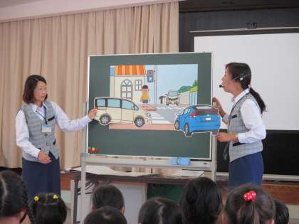 生活安全交通課から子供たちにクイズやパネルや映画で具体的に分かりやすく指導してもらいました。中でもトマトの約束は、「とまって!」「まって!」「とびださない!」