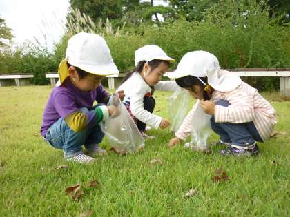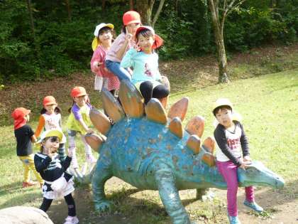 秋晴れの中、太閤山ランドまで遠足に行ってきました。ピクニック広場まで行き、恐竜を見たり、上に登ったりしました。子供たちは、大きな恐竜を見て「この恐竜知ってるよ」「顔こわいね」などと話をしていました。その後、アスレチックがある広場まで坂を登って行き、どんぐりを拾ったり、アスレチックで遊んだりして楽しんできました。ドングリは、とてもたくさんあり子供たちは何個も拾っていました。風が吹くと木からドングリが落ちてきて大喜びの子供たちでした。いっぱい遊んだあとのお母さんのお弁当おいしかったね。