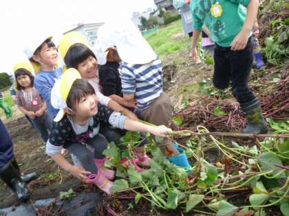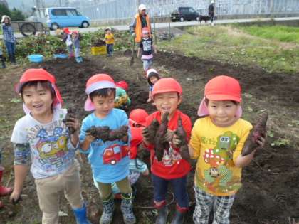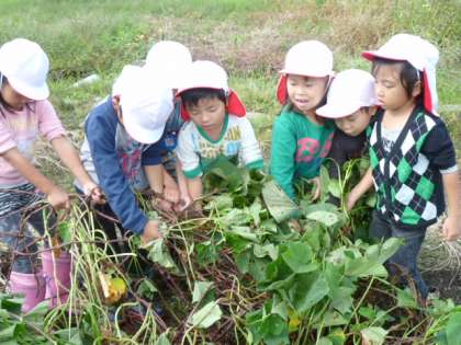 春に植えたさつまいもの苗。ツルが長く伸びて、収穫の日を楽しみにしていました。今日は天気にも恵まれ、みんなではりきって、さつまいも掘りに出掛けました。いつもお世話になっている民生委員の方々のご協力もいただきました。うんとこしょどっこいしょと言いながら、みんなでツルを引っ張るとおいしそうな芋が出てきて、子供たちは大喜び。それから、一生懸命掘って、大きな芋、小さな芋たくさん収穫しました。お家にお土産にしましたので、是非親子でさつまいもクッキングをいかがでしょうか。