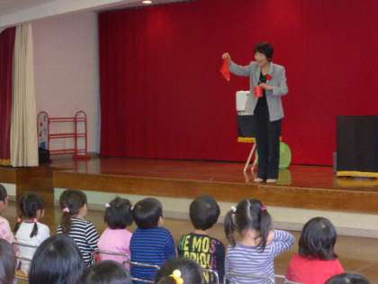 参観後は、大沢野地区のマジシャンである明堂さんの手品を見て子供たちは、「わ〜!」「どうして?」「不思議!」と楽しそうに声をあげながら、拍手していました。