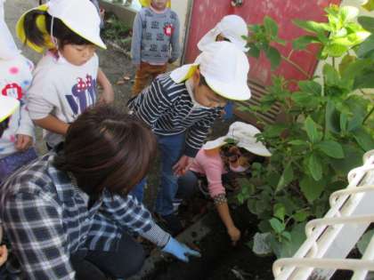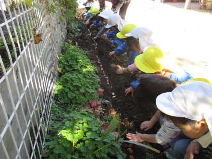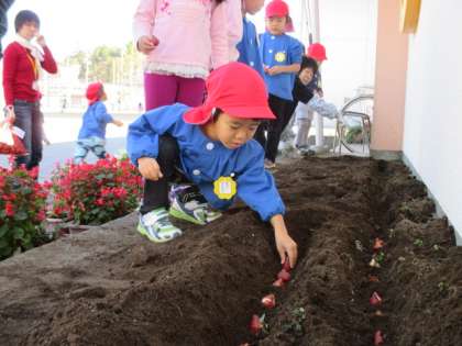 今日は、3・4歳児でチューリップの球根を植えました。穴を掘り、球根を置き泥の布団を優しくかけました。「みんなが一つ大きくなった春に咲くんだよ」と話しながら友達と咲くのを楽しみにして植えていました。