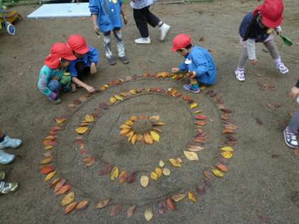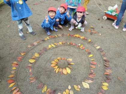 園庭で、色とりどりの落ち葉を見つけました。子供達は、「これひまわりだよ。ほら、ケーキみたいになったよ」と、きれいな落ち葉をみんなで並べ始めました。こんなに素敵な落ち葉の遊び。初冬の暖かな子供たちの様子でした。