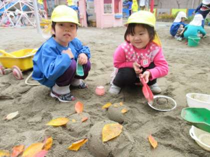 落ち葉を使って遊びました。砂場では葉っぱを耳にしてうさぎを作ったり、ケーキをデコレーションしたりして自分の思い思いの物を作って楽しんでいます。
