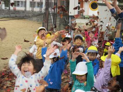 午後からは、小学校のグランドにあるたくさんの落ち葉を両手に持ち、空に向かって飛ばしたり、きれいな色の葉っぱを拾ったりしました。子供たちは「うわーきれい」「葉っぱ飛ばすの楽しい」と言いながら秋の自然に親しみました。
