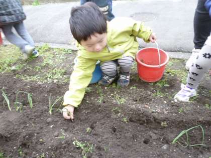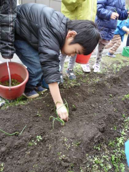 幼稚園の畑の草むしりをしてから、玉ねぎの苗を植えました。