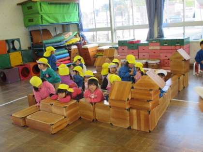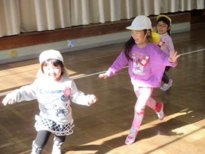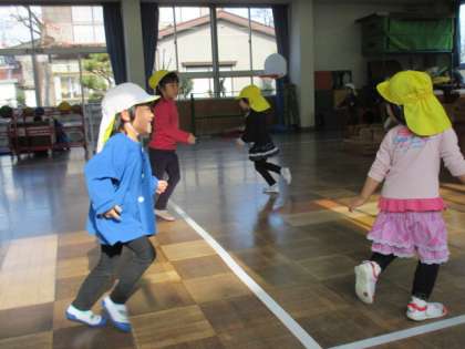 今日は、氷鬼ごっこをして遊びました。積み木で氷のお城をみんなで作り、鬼にタッチされた子は氷になってお城に入ります。子供たちは、鬼に捕まらないように速く走ったり、鬼が来ていないか周りを見て逃げたりしていました。子供たちがお城に入りる氷鬼ごっこを十分楽しんだ後は、タッチされたらその場で氷になる鬼ごっこもしました。
