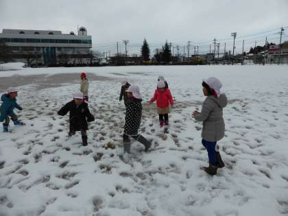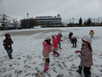 金曜日から降った雪が、校庭に真っ白に積もりました。雪が大好きな子供たちは、待ちきれなくて、早速、雪の上に・・・・。「つめたいね」「オラフ、つくろう」「もっと雪いっぱい降ってほしいな」など、みんな雪遊びを楽しみにしています。
