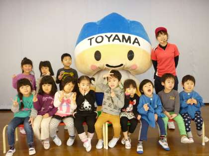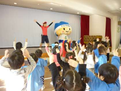 今日は、幼稚園にきときとくんが遊びにきてくれました。子供たちは、きときとくんと一緒に「きときと夢体操」をしたり、リズム遊びをしたりして楽しみました。きときとくんがジャンプしたり踊ったりしている姿を見て喜んでいました。最後に一緒に記念撮影をしました。お家でも楽しかったことを聞いてみてください。