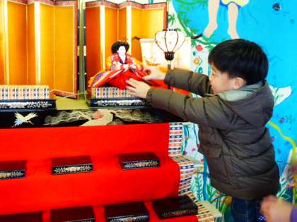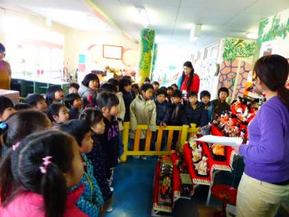 今日は、5歳児うさぎ組がお雛様を飾りました。人形の表情や持ち物をよく見て「お雛様の着物は12枚だよ」「この五人囃子さんは、何の楽器を持っているかな」など、話をしながら楽しく飾り付けをしました。