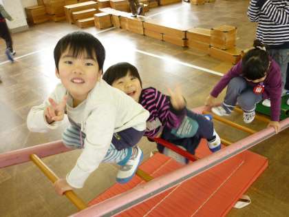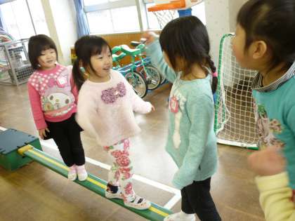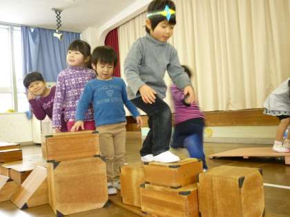 今日は、遊戯室で自分たちの考えた公園づくりをしました。「鉄棒つくりたい」「跳び箱も」「積み木で迷路もつくる」と、子供たちは自分の思いを友達に伝え、一緒につくりました。一本橋では「友達と出会うとじゃんけんをする」「迷路の中には、ワニが泳いでいるから落ちたらだめだよ」と、遊びながら子供たちでルールを考えて楽しく遊びました。