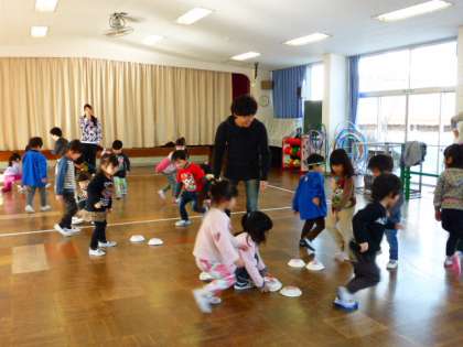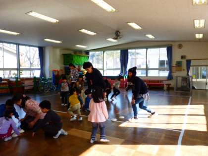 ゲーム遊び、男の子対女の子と大人対子どものチームで遊びました。パパ先生もママ先生も子どもたちと一緒に真剣勝負でした。どっちのチームが勝ったかは、お子さんに聞いてみてくださいね。
