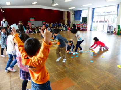 3歳児の部屋にママ先生が来てくれました。ママ先生も一緒に、子供たちの大好きなドッチボールをして遊びました。ママ先生も、大ハッスル!また一緒に遊びましょうね。