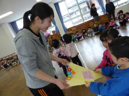 2名の教育実習生のお別れ会をしました。お姉さん先生が「てぶくろ」のペープサートと、楽しい折り紙ゲームをしてくれました。みんなで楽しい時間を過ごしました。また幼稚園に遊びに来てね!