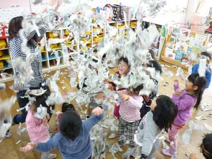 音楽に合わせて新聞をちぎって遊びました。始めは、大きくちぎっていた子供たちですが「細かくちぎろうね」と声をかけると、細くなるようにちぎっていました。たくさんちぎった新聞紙をみんなで飛ばすと「先生すごいね」「もう一回やろう」と子供たちで声をかけ合いながら何度も飛ばしてお部屋の中は新聞でいっぱいになりました。その後も音楽に合わせて、袋の中に入れる競争をして片付けました。