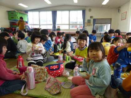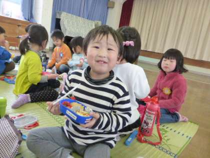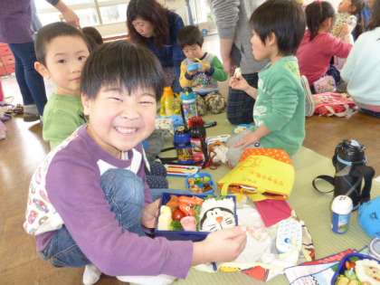 今日はみんな、一緒にお弁当を食べました。お母さんやおばあちゃんが心をこめて作ってくださった美味しいお弁当を「ほら、ぼくのお弁当、妖怪ウォッチだよ」「私のは、ドラえもんなの」と自慢げに見せあいながらいただきました。ほっぺが落っこちそうになっているみんなの笑顔がとても可愛かったです。すてきなお弁当をありがとうございました。