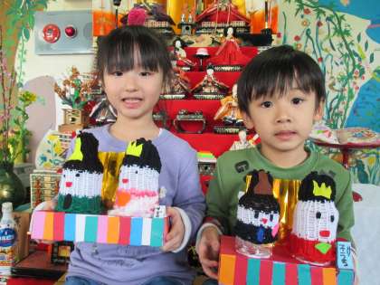 5歳児うさぎ組の子供たちは、編み機でお雛様をつくりました。とても根気のいる製作でしたが、一人一人が好きな毛糸の色を選んで、編みあげました。世界に一つだけのお雛様とお内裏様になりました。みんなで飾ったら、春がそこまで来ているような華やいだ雰囲気になりました。