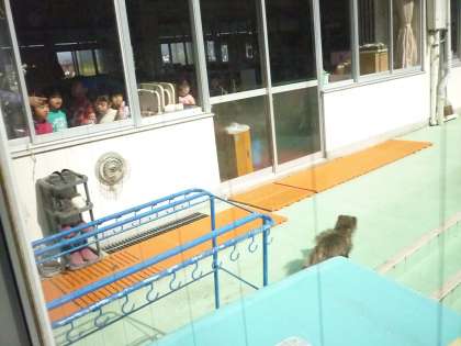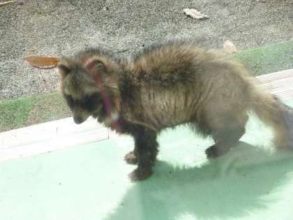 今日、年少組のクラスのテラスにタヌキの子供が遊びにきました。タヌキがビックリしないように静かに見ました。子供たちに気が付いたタヌキは、歩きだし小学校のグランドへ行ったので、散歩の準備をして追いかけました。子供たちは「ちょっとこわいね、でも可愛い」「タヌキ、家の所に行ったね」「しっぽふわふわだね」と友達同士で話をしていました。散歩から帰ってくると、園にいた先生たちにも「タヌキがいたよ」「タヌキ探してきたの」と見てきたことを話していました。また、幼稚園に遊びに来てくれることを楽しみにしている子供たちです。