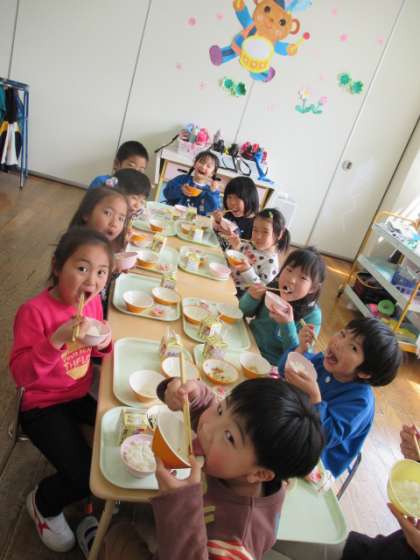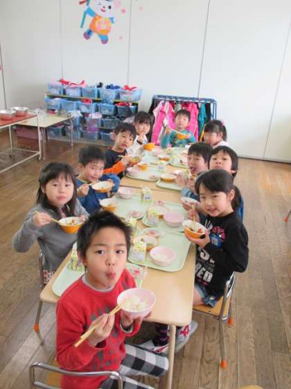 今日は、今年度最後の給食でした。5歳児うさぎ組にとっては、幼稚園で食べる最後の給食。大好きな給食をおかわりして、モリモリ食べていました。嬉しそうに食べる子供たちを見ながら「たくさん食べるようになったなあ、体も心も本当に大きくなったなあ」と、私たちも嬉しい思いでいっぱいになりました。