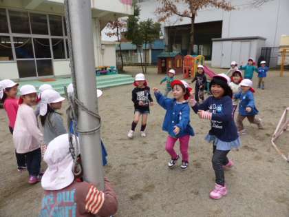 また、園庭に出るとクラスの皆で「だるまさんが転んだ」が始まりました。友達大好き!チームワークが自慢のうさぎ組。最近は、特に「みんなで○○がしたい」と誘い合っています。子供たちなりに残り少ない幼稚園生活を満喫しようと楽しく遊んでいます。