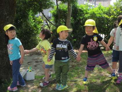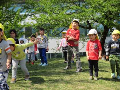 暑い夏日ですが、子供たちは朝から元気いっぱいです。小学校のグランドで走ったり、園庭でリレーをしたりして駆け回っています。築山の木陰で寝転がって、休んでから「だるまさんがころんだしょう」と皆で楽しみました。子供たちの大好きな遊びのひとつですが、「ころんだ!」とピタッツと止まってポーズがかっこいい子供たちでした。