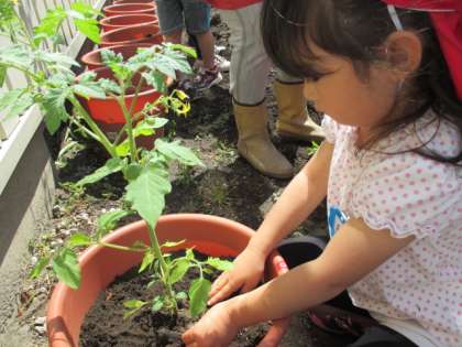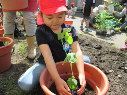5歳児うさぎ組の子供たちは自分で、枝豆やピーマンなど育てたい野菜を選び、自分の鉢に植えました。