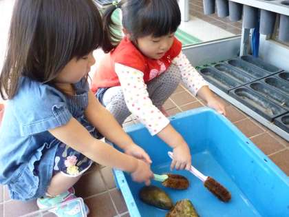 昨日の散歩でオタマジャクシを捕まえてきました。子供たちは「赤ちゃんのオタマジャクシ可愛い」と、水槽のまわりに集まり見ていました。子供たちと話をして、お世話をすることにしたので、図鑑でエサを調べたり、水槽を掃除したりしています。カメ・カニのお家の掃除もたわしでゴシゴシ洗ってくれます。子供たちと一緒にお世話することを通して、興味や関心がもてるようなればいいなと思います。