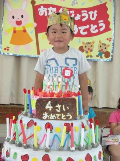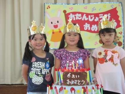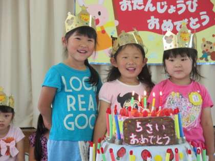 5月生まれのお誕生会をしました。「♪はっぴぃばぁすでい、とぅゆう」と、可愛い歌声で7人のお友達のお祝いをしました。どの子もニコニコの笑顔でお話も上手にできました。また一つ大きくなったね。