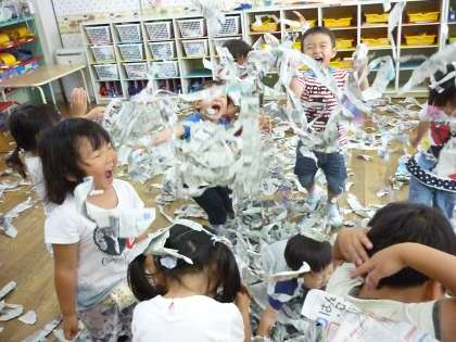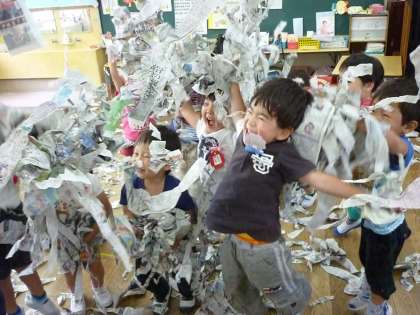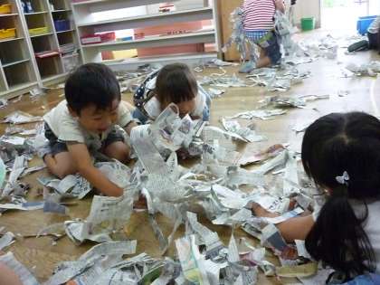 たんぽぽ組は、新聞を使って遊びました。初めは、新聞を細く長くちぎっていきました。なかなか新聞を細くちぎるのは難しかったのですが、枚数を重ねていくことで少しずつ細くちぎることができるようになりました。たくさんの新聞をちぎると子供たちは、自然と新聞を集めて高く飛ばしたり、新聞の中を泳いだりして楽しんでいました。みんなで新聞を集めて飛ばすと「先生、おもしろいね」「もう一回しよう」と、友達や教師に声をかけながら遊んでいました。十分遊んだ後は、袋の中に新聞を集めてボールを作りました。高く投げてキャッチをしたり、ボール投げの的に当てたりして遊びました。