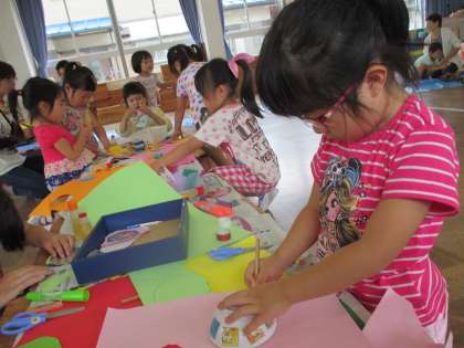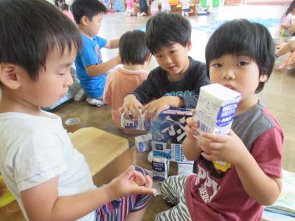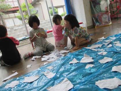 「エルサのお城に行く迷路を作りたい」という子供たちの声がきっかけで、冒険ごっこが始まりました。「スタートしたら一本橋渡ろうよ」「川を飛び越えたらマシュマロンを倒すのはどう?」「氷の階段を登ったらゴールがいい」「最後に銀メダルもらえるのにしたい」とみんなのイメージがどんどん膨らんでいます。今日は遊びに必要な物を考え、川に住むザリガニや、空き箱を組み合わせたマシュマロン、氷の結晶、キラキラ銀メダル作りが盛り上がり、夢中で取り組んでいました。みんなで冒険ごっこをするのが楽しみです。
