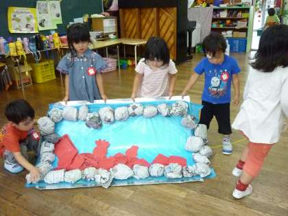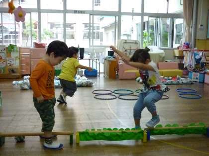 たんぽぽ組では、毎日カエルになって遊んでいます。自分たちで運動棒やカエルジャンプをする輪っかを並べたり、一本橋と池を友達と一緒に準備したりして子供達が考えたカエルの遊び場を作って遊んでいます。運動棒を横に並べてジャンプしたり、つなげてジグザグジャンプや一本橋にして渡ったりしながら、自分たちで遊び場を工夫していろいろなジャンプを楽しんでいます。今日は、輪っかを三つ横に並べてカエルのようにジャンプができるように考えていました。今度は、どのような楽しいアイディアが子供たちから出てくるのかが楽しみです。