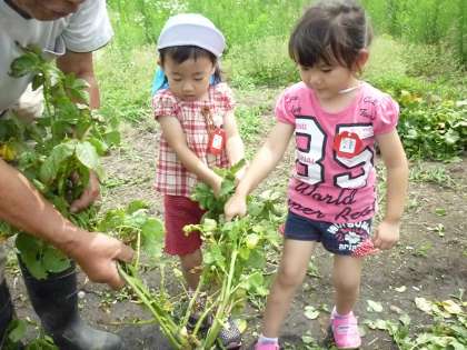 先週5歳児うさぎ組の子供たちがじゃがいも掘りに行っているのを見て、「僕たちも行きたいな〜」と思っていた3歳児たんぽぽ組と4歳児ひまわり組の子供たち。