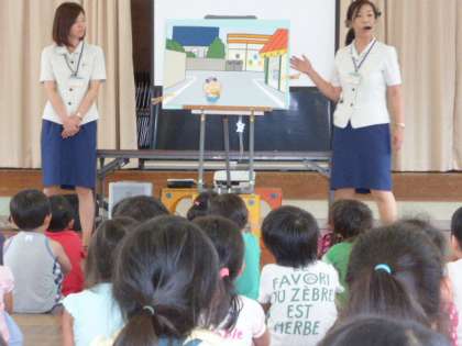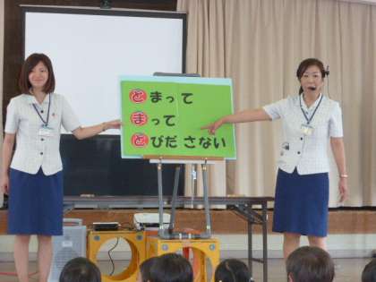 今日は、生活交通安全課の指導員の方に来ていただき、交通安全教室がありました。交通事故に遭わないように約束をしました。「とまと」の約束、止まって・待って・とびださないを歌いながらポーズと一緒に覚えました。皆で覚えておきましょうね。