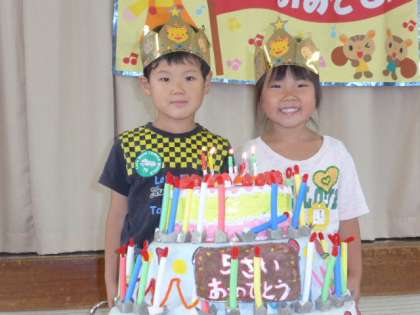 今日は、7月生まれの誕生会をしました。5歳の誕生日を迎えた2人の友達をみんなでお祝いしました。自己紹介をして、友達からの質問に答えた誕生児の子供たちは、緊張しながらもニコニコ笑顔で答えていました。