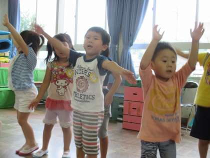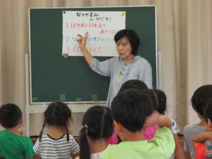終業式で子供たちは、園長先生と夏休みのお約束を3つ(1早寝早起き朝ごはん、2ラジオ体操に行く、3絵本を読む)しました。最後は皆でニンニンジャーの盆踊りを踊って楽しみました。