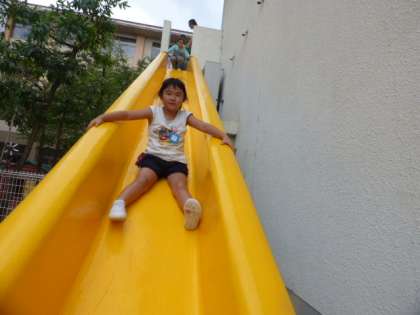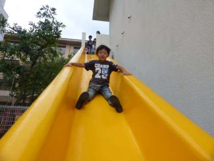 8月中に、園舎東側の非常用滑り台を滑りやすく修繕してもらいました。2階から滑り下りられるようになったので、今日は、年長児が一人ずつ滑り下りる練習をしました。今後は、避難訓練を積み重ねながら、すばやく避難できるようにしていきます。初めての練習でしたが、怖がる子はいませんでした。火事や地震、豪雨など、いろいろな災害が起きていますが、幼稚園でも避難経路の確認をしていきたいと思います。