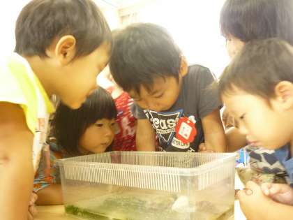 1学期からお世話をしているザリガニのお腹に、卵がついているのを夏休みの登園日に見つけた子供たちは「いつ産まれるかな」と毎日観察ケースを覗き込んで見ています。「ぶどうみたいだね」「いっぱいついてるね」と、子供たち同士で話をして色々な事に気付いています。卵の色が、少しずつ紫色から透明に変わっていくのを不思議そうに見ていました。今週に入り、ほとんどの卵が透明になり、ザリガニの体が見えてきたことが嬉しくていつ産まれるかなと楽しみにしています。