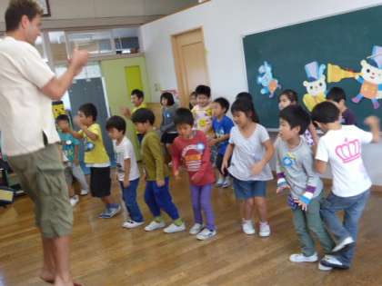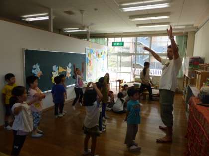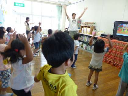 年長組は、毎月2回、楽しい英会話をスロボダン先生(通称ダン先生)から教えてもらう「英語で遊ぼう」の時間があります。今日のハロータイムは、歌やダンスを一緒にして楽しい時間でした。正しい英語の発音や簡単な挨拶、単語を遊びの中で自然に身につけて行きます。