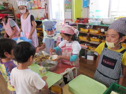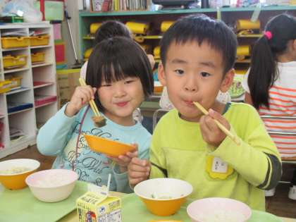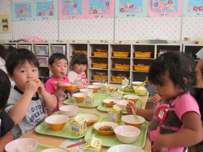 運動会まであと3日となりました。子供たちは毎日元気に体を動かし、競技や演技に取り組んでいます。元気いっぱい体を動かすとお腹もぺこぺこ…「おなかへったー」「今日の給食何かな」と給食を楽しみにしている子供たちです。今日の献立は、ご飯・味噌けんちん汁・さかなのねぎソースかけ・にらのごまびたしでした。年長組さんが放送で毎日の献立を知らせてくれます。お当番さんもはり切って配膳のお手伝いをしてくれています。「お魚おいしい!」「先生ご飯おかわりする!」と今日もお腹いっぱい食べました。どんどん大きくなーあれ!!