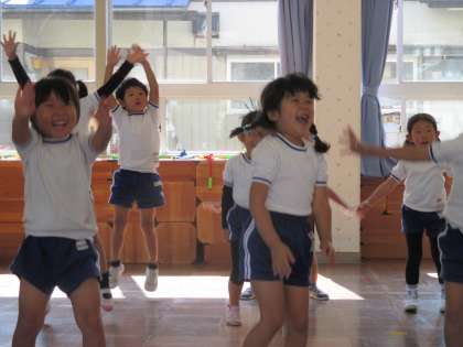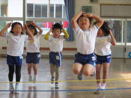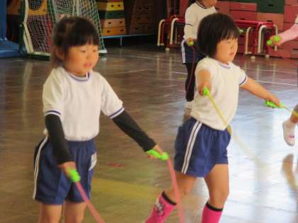 今日の体操教室は「なわとび」でした。準備体操も新しくなり、「夢をかなえてドラえもん」の♪しゃらららんら〜の音楽に合わせて元気に体操をしました。2本の長い縄の上をウサギやカエルになってぴょんぴょん跳んだり、ワニになって縄の下をくぐったりと、いろんな動きを楽しみました。前跳び・後ろ跳びの跳び方も教えてもらい、何度も練習しました。これからもたくさん練習していきたいと思います。縄を上手に片付けられるようになり、結ぶ手つきもなめらかです!!