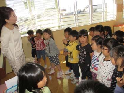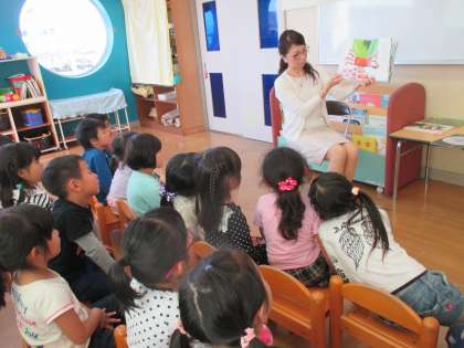サウンド・オブ・ミユージックから「ドレミの歌」を皆で歌うことから始まりました。初めてなのに、リズムに乗って『ド!』『レ!』『ミ!』と身体を揺らしたり足踏みしたりしてとても楽しそうに歌う子供たちでした。それから絵本「お月さまってどんなあじ?」や「さるかに」などの絵本を読んでもらい、真剣なまなざしで聞き入っていました。