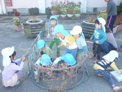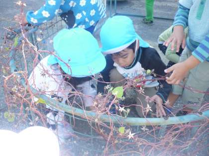 今日は、夏の間きれいに咲いていたアサガオやフウセンカヅラの種をとりました。子供たちは、茶色になった種を手のひらに置いて小さな種をひとつひとつ摘まんでいました。みんなで集めた種を見て「大きいのと小さいがあるね」と、種の大きさに気が付いていました。春になっったら、園庭に植えたいと思います