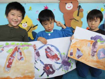 大きなさつまいもを見ながら、「くねくねしてるね」「ここは紫色だけど茶色のところもあるよ」「葉っぱは緑だけど中の線は紫色だ」「おもしろいね」と話していて、さつまいもの色や形の違い、葉っぱや葉脈の色など、細かいところにも気付いている子供たちでした。和紙を小さくちぎってちぎり絵もしました。
