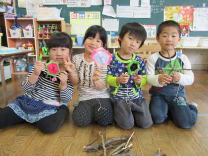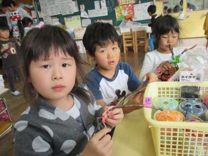 みんなで集めてきた小枝を組んで、好きな色の毛糸をグルグルとまわりに張って飾りを作っています。「クモの巣みたいになるね」と模様を楽しんだり「どの毛糸にしようかな」と色を選んだりしながら作っています。先日、遠足で拾ってきたドングリやまつぼっくりもつけて仕上げようと思っています。