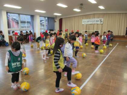 4歳児ひまわり組は2回目のサッカー教室でしたが、自分からボールを取りに行ったり一生懸命シュートを決めようとしたりしていたところに成長を感じました。