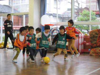 そのあと8チームに分かれて、試合をしました。今日のチームは4歳児と5歳児の混合チーム!「がんばろうね」と声をかけあい、ボールを追いかけてゴールめがけてシュートを決めていました!