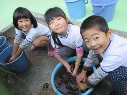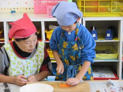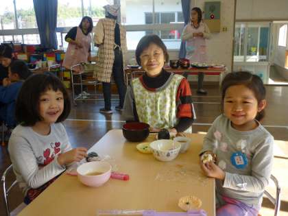 先日畑で収穫したサツマイモや、ご家庭からいただいた大根・ニンジン・里いもなど、たくさんのお野菜を使ってさつま汁を作りました。年少さんは野菜をちぎり、年中さんは野菜をきれいに洗って、皮むきに挑戦!年長さんはおぱあちゃんや先生と一緒に野菜を切るお仕事を頑張りました。台所からはおいしそうな匂いが廊下に漂い「なんかいい匂いする」「あー早く食べたい」と待ち遠しい子供たち。お昼には遊戯室に全学年が集まり、みんなでお腹いっぱい食べました。大学いもやカブのお漬物も一緒においしくいただき、満足そうな子供たちでした。お手伝いしてくださったおぱあちゃんがた、ありがとうございました。