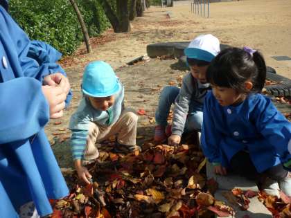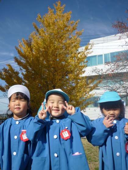 今日は、天気が良かったので小学校の築山に行って遊んできました。イチョウの葉っぱが黄色くなりとてもきれいだったので記念写真を撮ったり、落ち葉を集めて焼き芋や豆を焼いたりしてごっこ遊びも楽しみました。