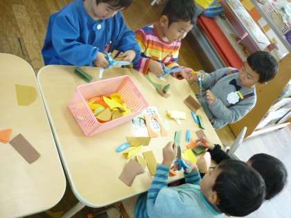 午後からは、画用紙で切り紙をして葉っぱをはさみで切りました。イチョウの葉を見てきた子供たちは、少し切るのが難しかったですが「やってみたい」とイチョウの葉っぱの切り紙を挑戦していました。子供たちが切った葉っぱは、発表会の幕の飾りに使います。上手に切って、かわいい作品に変身した葉っぱを見てあげてください。